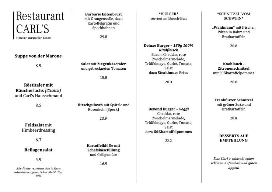 | Küche bis 21:30 Uhr Last Order 21:10 Uhr | |